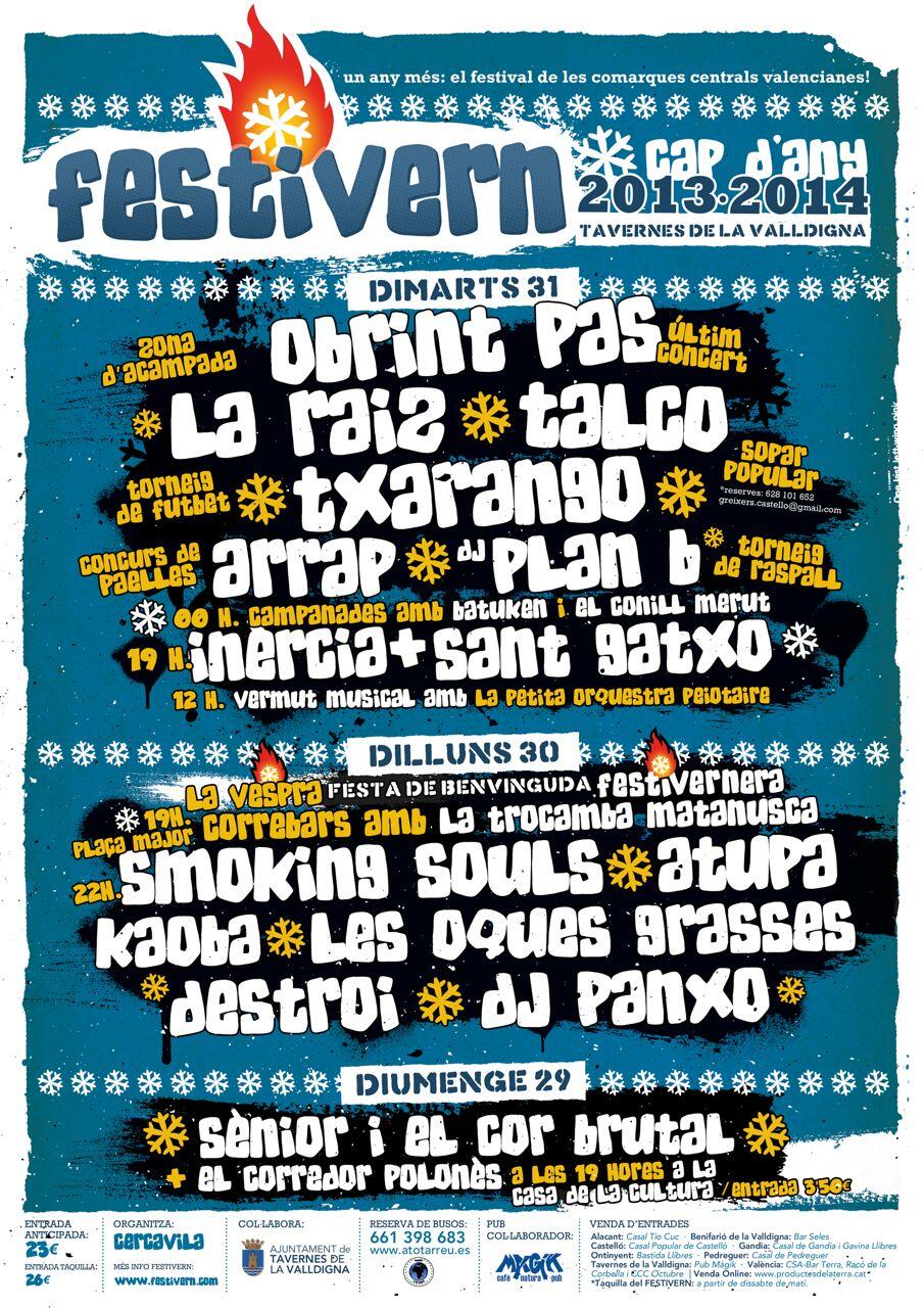 Entrada per la nit de cap d’any del Festivern 2013-2014: Últim concert elèctric d’Obrint Pas, La Raiz, Talco, Txarango, Arrap, DJ Plan B, SantGatxo, Inèrcia… Campanades amb Batuken i el Conill Merut.